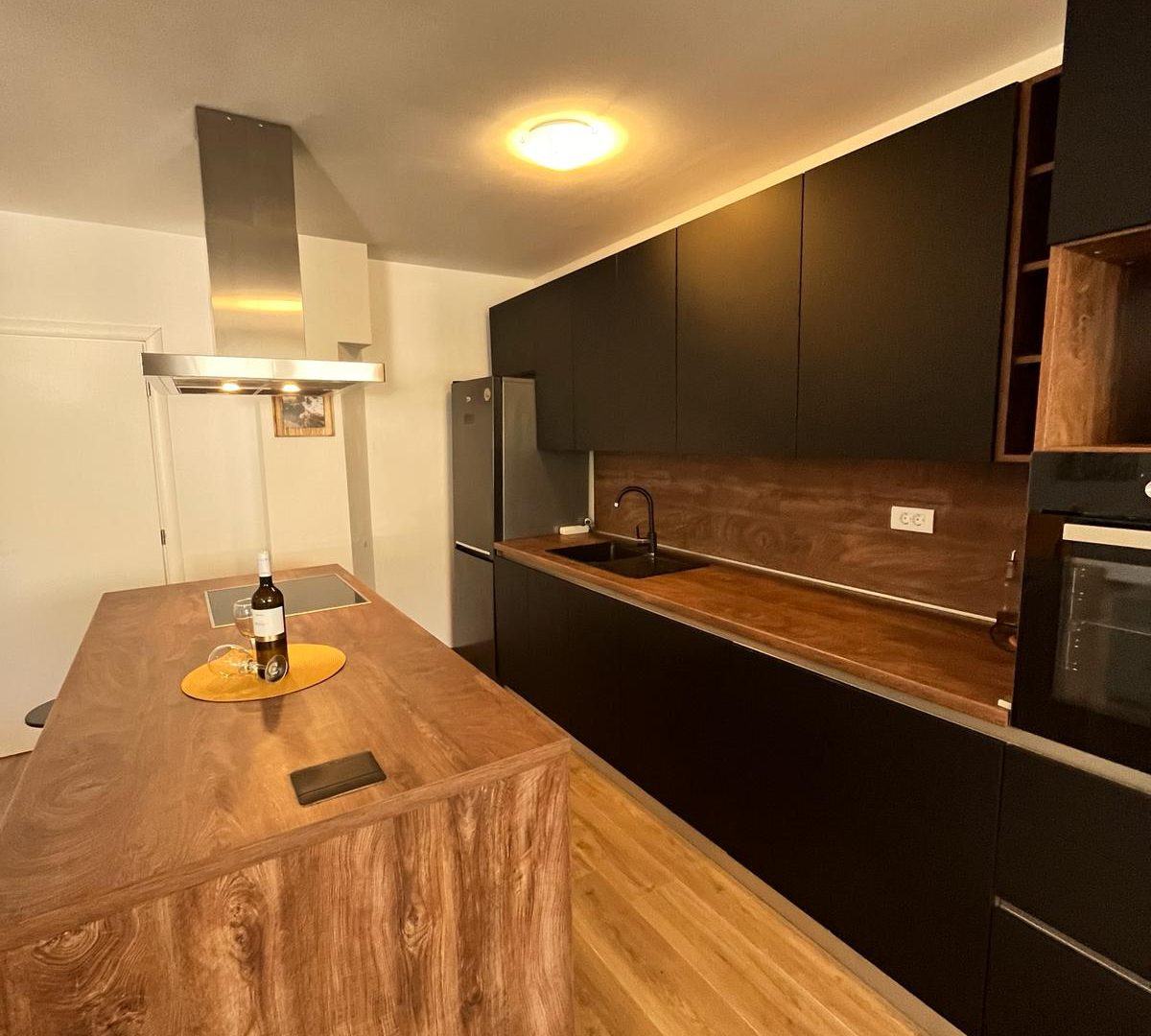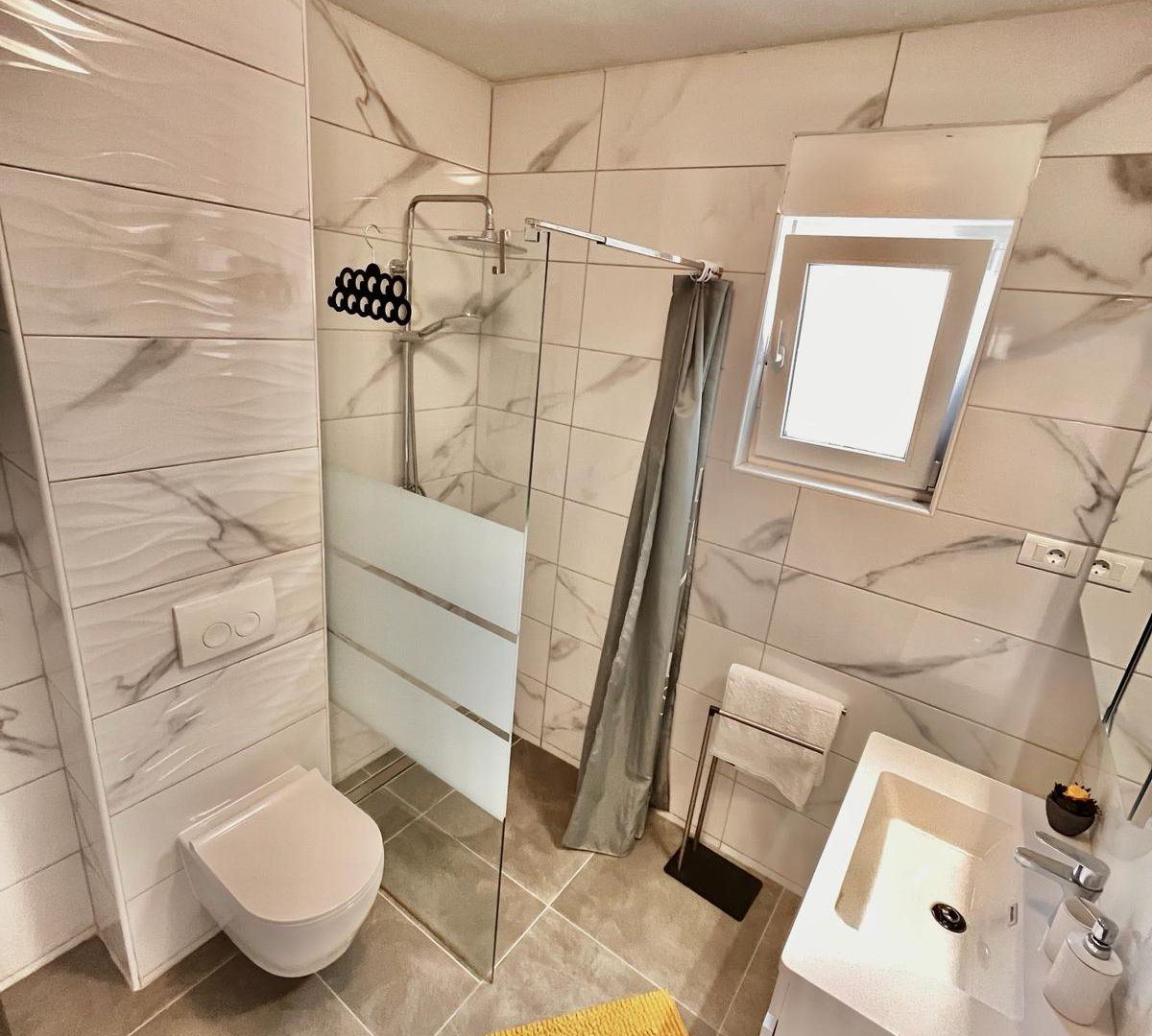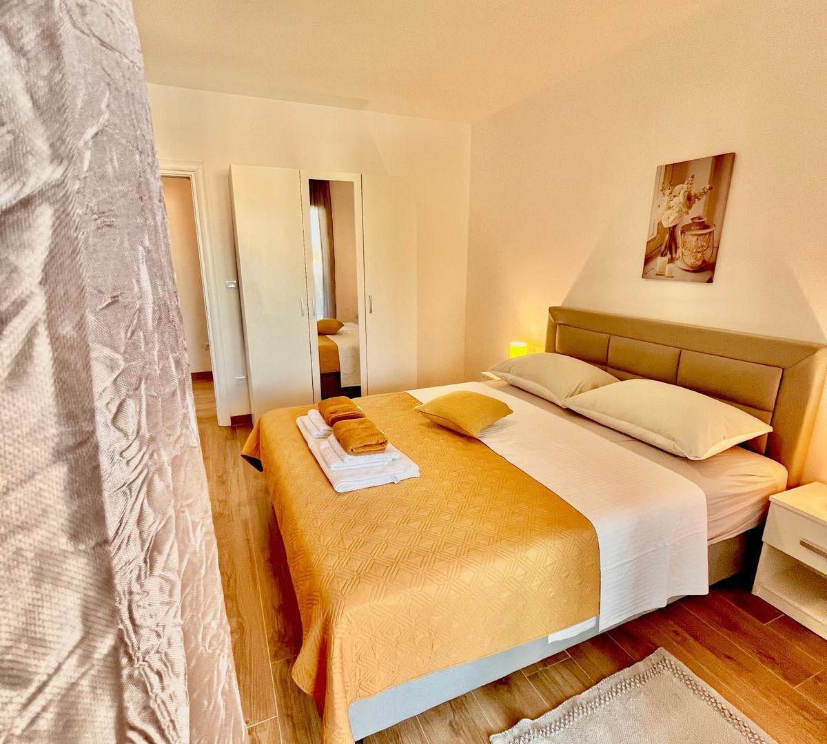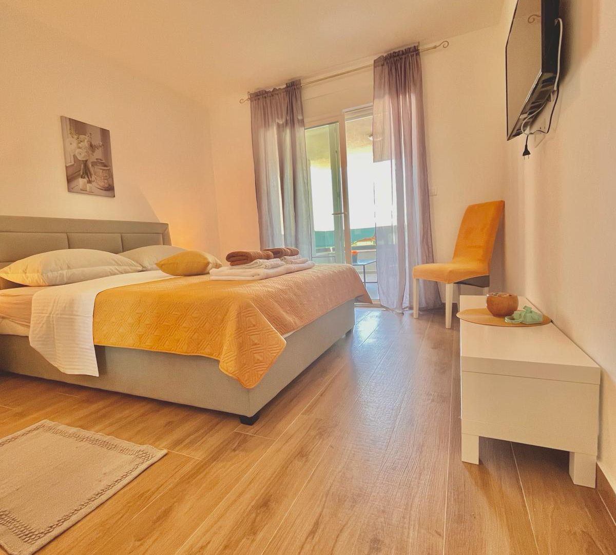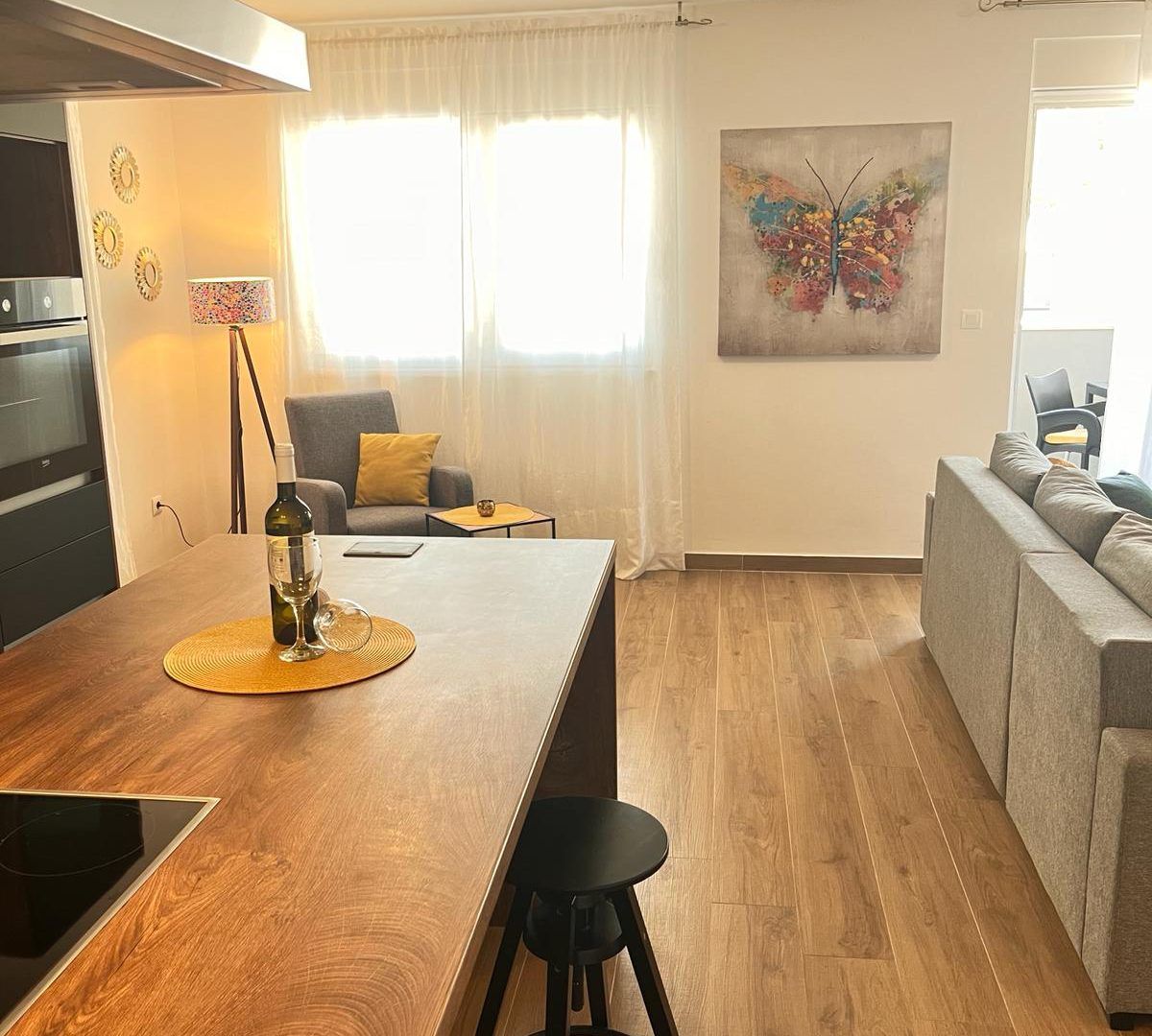 Villa Marco offers a spacious 100 m² deluxe apartment with access to the swimming pool. The apartment features an open-plan layout that connects the kitchen, dining area, and living space, creating a comfortable and airy environment. It includes two bedrooms, each with its own balcony and open sea views. The modern kitchen is fully equipped and features a practical kitchen island.