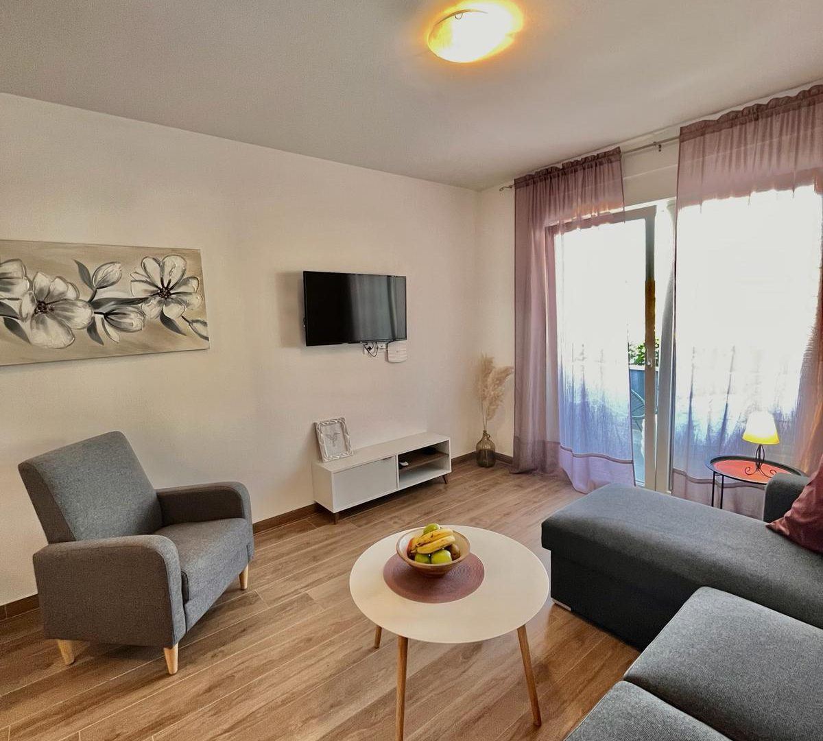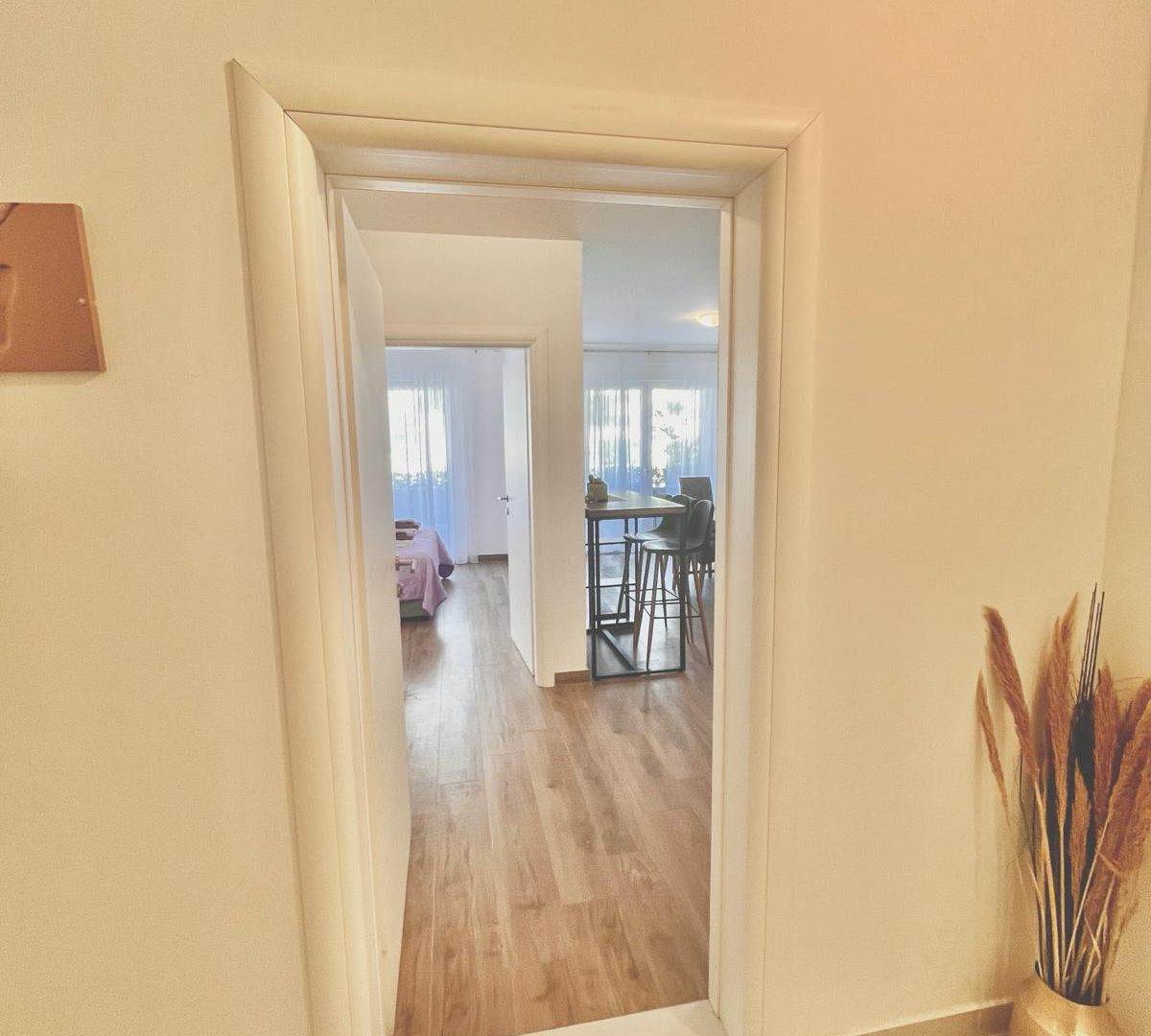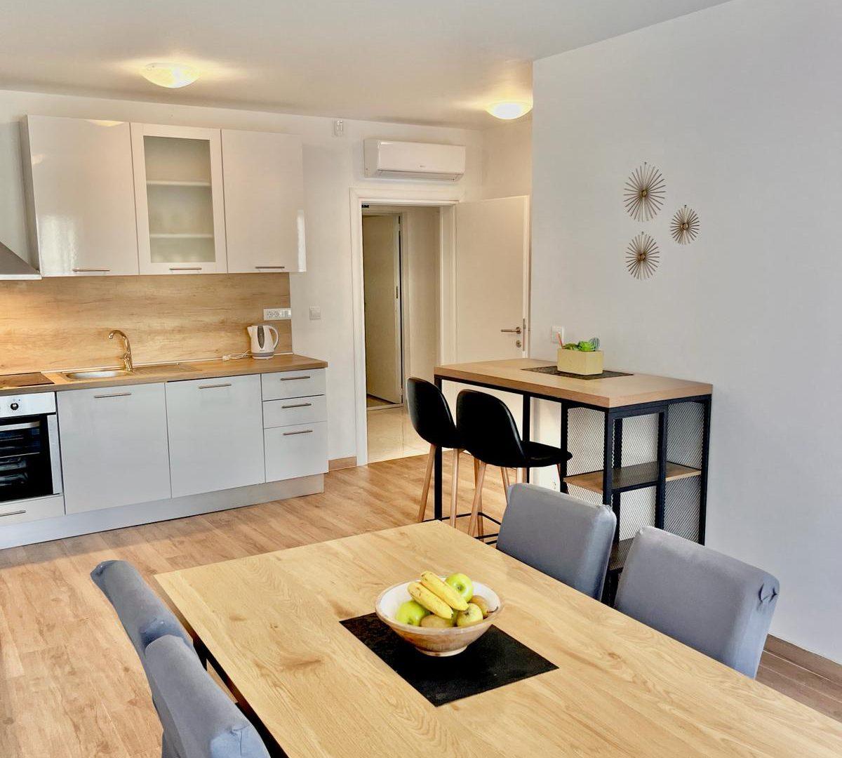 This apartment includes a fully equipped kitchen, a dining area, a separate living room with a sofa bed, and a balcony with sea views. With 80 m² of space and a private entrance, it’s designed for a relaxed and convenient stay. The kitchen comes with everything you need, including a dishwasher and oven.
